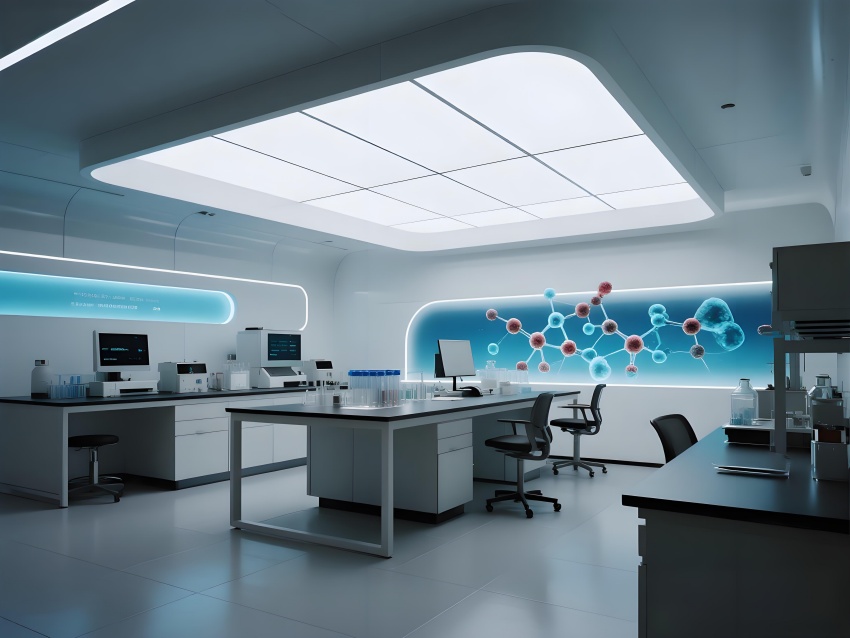 本設計以"科技賦能生命"為核心理念,構建純凈高效的研發環境。主體采用冰川白與醫用藍的漸變配色,墻面嵌入動態生物分子結構LED裝飾,營造科研儀式感。實驗區采用模塊化懸浮工作臺,透明智能玻璃隔斷實現空間通透性與功能分區的完美平衡。頂棚的流線型送風系統與地面熒光導視帶形成立體動線指引。核心無菌區采用圓形穹頂設計,搭配全息投影滅菌提示界面。數據分析中心配備曲面智能白板墻,實時可視化研究數據。危化品存儲區通過紅色光暈警示與物理隔離確保安全。整體空間融合醫療級潔凈美學與科幻實驗室語言,在嚴謹中注入未來感,通過智能交互界面與人性化燈光系統,打造國際一流水準的醫藥研發矩陣空間。